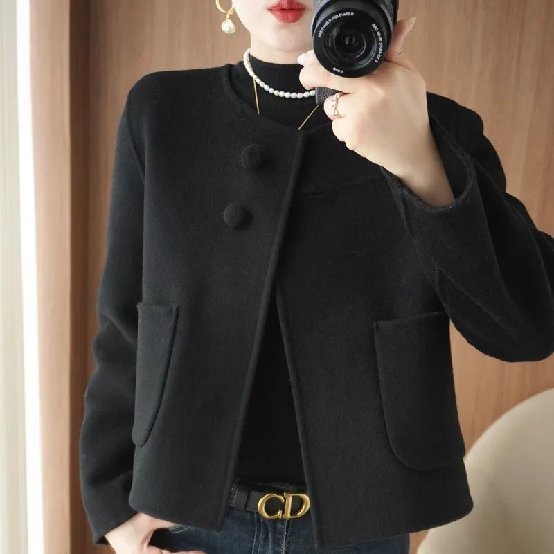 秋冬新款氣質圓領小香風雙面呢大衣女百搭毛呢外套