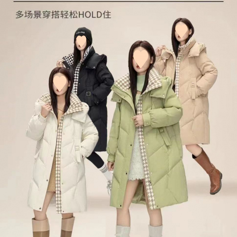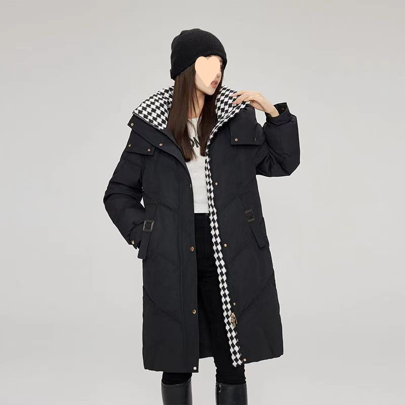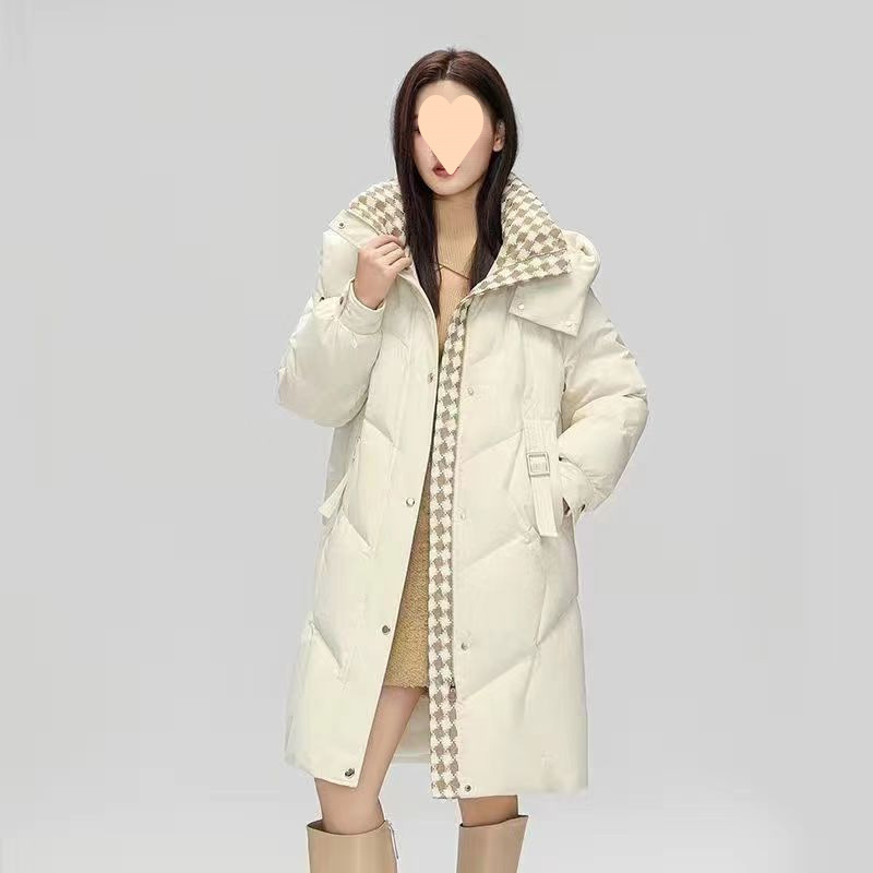 菱格撞色拼接韓版棉服長款可拆卸帽加厚外套