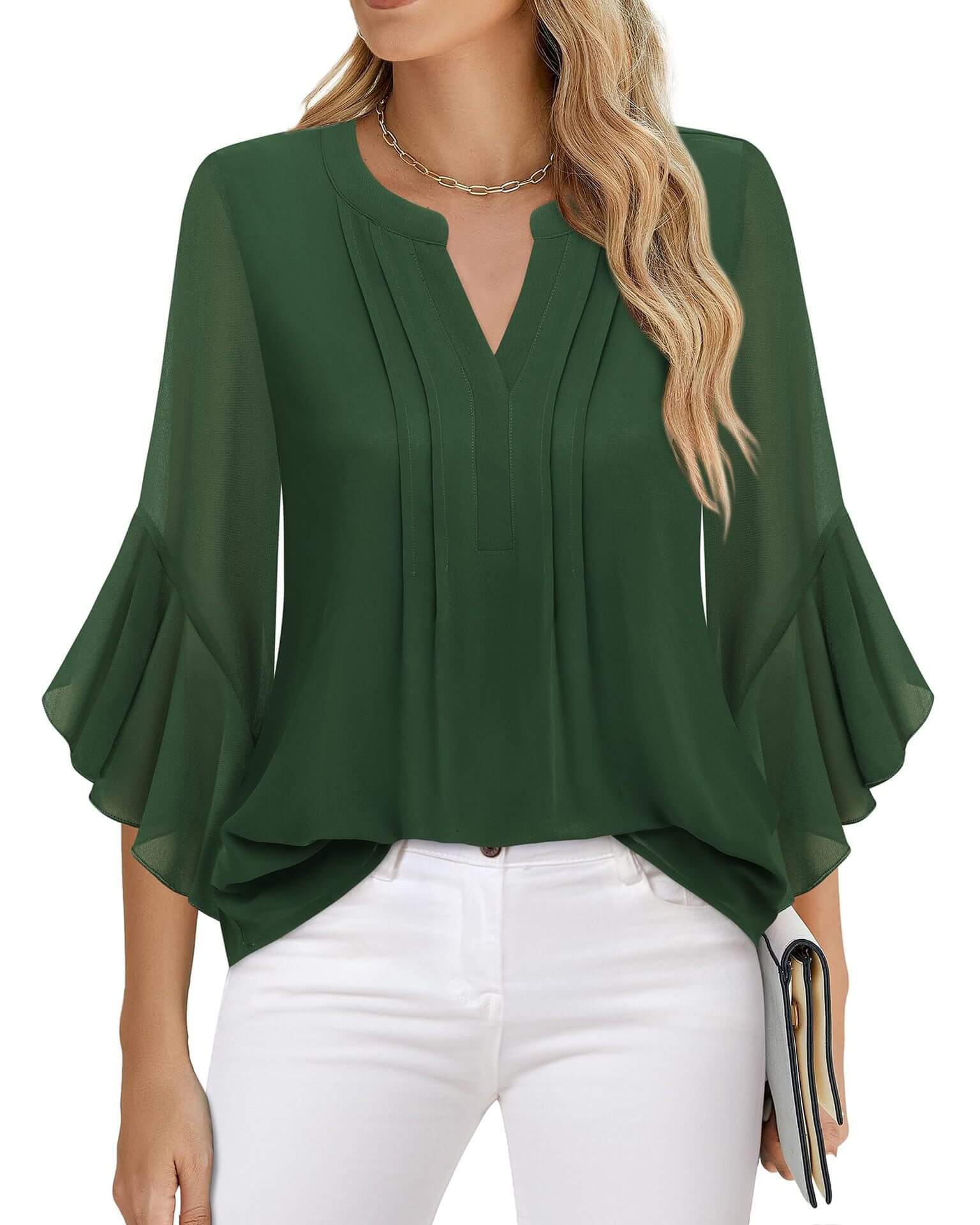 【亞馬遜爆款】時尚純色寬鬆V領荷葉七分袖上衣~休閒百搭,氣質優雅,怎麼搭配都好看!